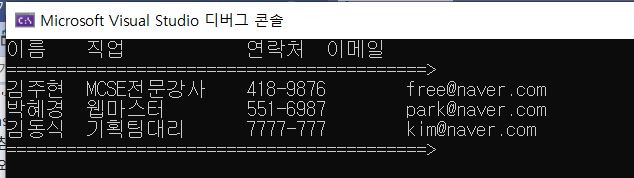 cout << "이름\t직업\t\t연락처\t이메일";