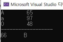 정수형을 문자로 출력하기 위해 캐스트연산자(char)를 사용해야한다.