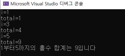 cout << "1부터5까지의 홀수 합계는 " << total << "입니다" << endl;