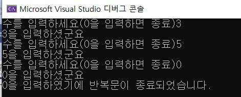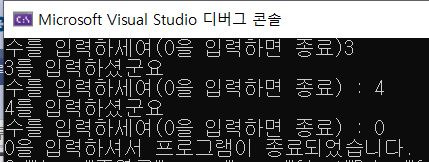 cout << "수를 입력하세요(0을 입력하면 종료)";